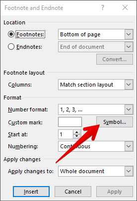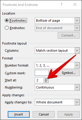 اگر می خواهید پاورقی ها یا ته نویس ها در جایی غیر از شماره اول سریال شروع شوند (به عنوان مثال ، ۲ به جای ۱) ، روی فلش های موجود در کادر بازشوی
