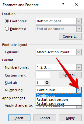 ” Restart Each Page” را انتخاب کنید تا یادداشت های خود را براساس صفحه شماره گذاری کنید