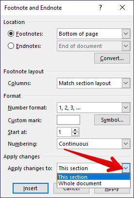 پس از پیکربندی گزینه های فوق، باید نحوه اعمال تغییرات را در سند خود انتخاب کنید. در انتهای منو، روی فلش منوی کشویی کنار گزینه