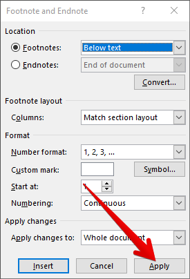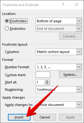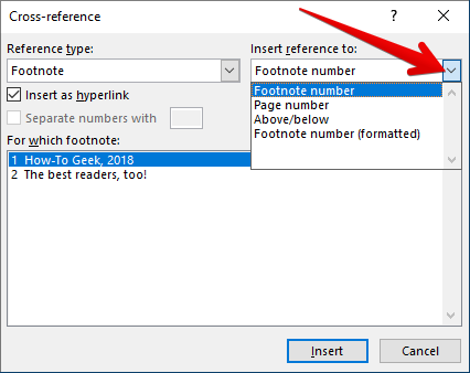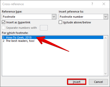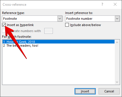 “Insert as Hyperlink” به صورت پیش فرض انتخاب شده است، بنابراین می توانید روی هر مرجع کلیک کنید و به طور خودکار به بخشی از سند حاوی پاورقی اصلی منتقل می شوید. توصیه می کنیم تیک این گزینه را بر ندارید، اما در صورت تمایل می توانید آن را بردارید