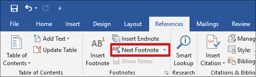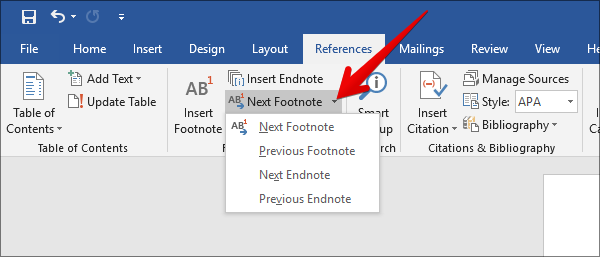 “Footnote Next” کلیک کنید تا گزینه متفاوتی را انتخاب کنید. می توانید انتخاب کنید که به پاورقی قبلی بروید یا به متن اصلی بعدی یا قبلی بروید