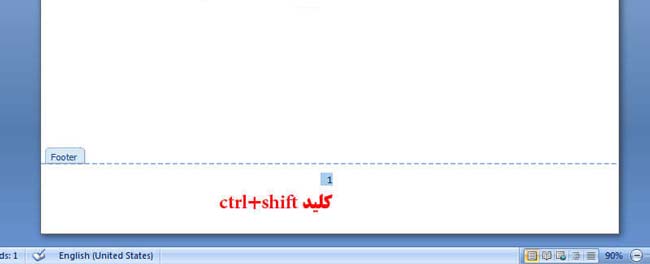 Footer را فعال کنید. روی کادری که دور شماره صفحه را گرفته کلیک کنید و سپس کنترل و شیفت سمت راست را باهم فشار دهید
