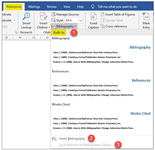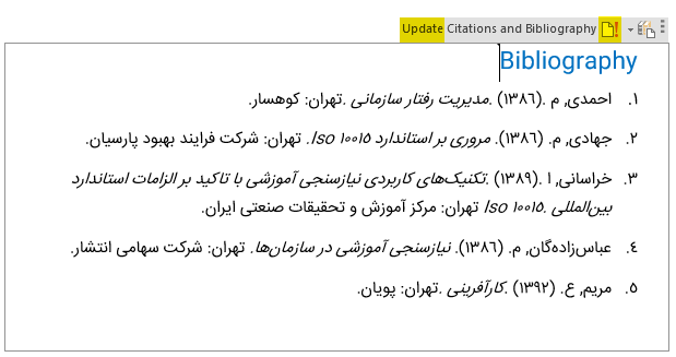 در قسمت Insert Bibliography میتوانید، لیست تمام منابعی که به سند خود وارد کردهاید، ببینید.