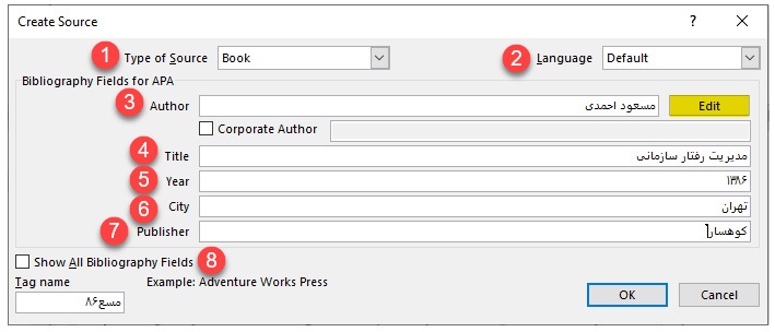 با تیکدار کردن گزینه Show All Bibliography Fields آیتمهای بیشتری ظاهر میشود. آیتمهای ستارهدار را حتما باید پر کنید.