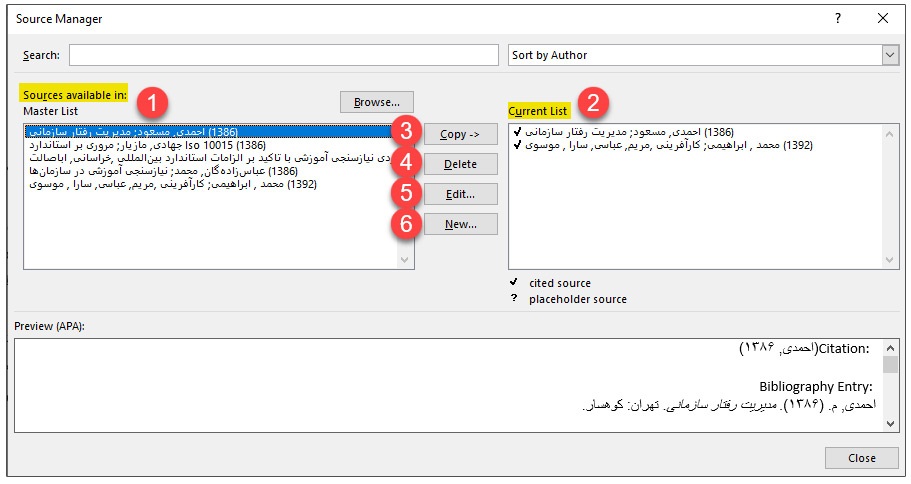 برای وارد کردن منابع تکراری در اسناد مختلف نیاز نیست آنها را در هر سند جداگانه ایجاد کنید. نرمافزار ورد هر منبعی که ایجاد و ذخیره میکنید، در لیستی به نام