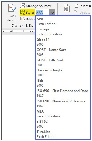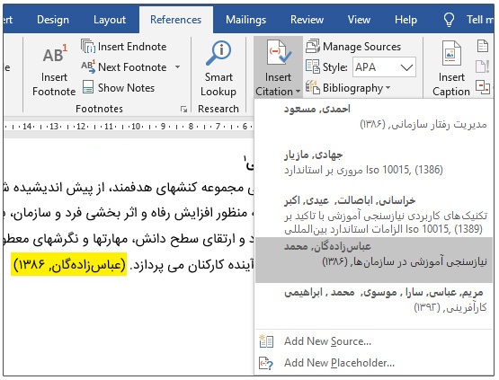 Insert Citation کلیک کنید، لیست منابعی را که میتوانید در سندتان استفاده کنید، مشاهده میکنید. با کلیک روی هر کدام وارد سند شما میشود