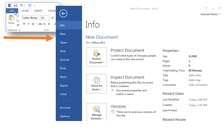 نمای پشت صحنه گزینه های مختلفی را برای ذخیره، باز کردن پرونده، چاپ و به اشتراک گذاشتن سند خود به شما می دهد