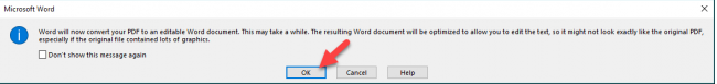 ۵- در این مرحله یک پیغام را دریافت می کنید ، به شما هشدار می دهید که ممکن است برخی از قالب بندی های موجود در فایل PDF از دست برود. اما جای هیچ گونه نگرانی نیست ، اصل فایل pdf شما باقی خواهد ماند. در حقیقت به شما هشدار می دهد که سند ورد جدید که از پی دی اف ایجاد می کنید ، دقیقاً مشابه فایل اصلی نیست. در نهایت بر روی گزینه Ok کلیک کنید.