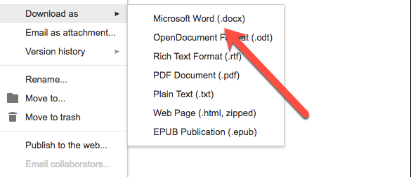 ۸- در منو ظاهر شده بر روی Download As کلیک کرده و سپس گزینه Microsoft Word (.docx) را انتخاب کنید.