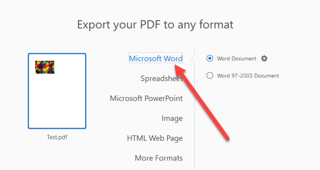 مرحله ۲: اکنون گزینه Microsoft Word در سمت چپ پنجره انتخاب کنید. سپس، در سمت راست بر روی Word Document کلیک کنید تا فایل PDF را به یک سند ورد مدرن در قالب DOCX تبدیل کند. با انتخاب گزینه Word 97-2003 Document ، فایل پی دی اف به یک سند Word با قالب قدیمی DOC تبدیل خواهد شد.
