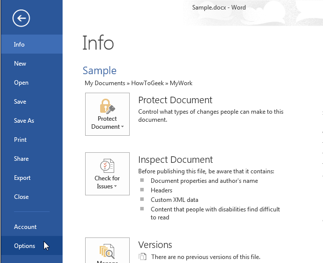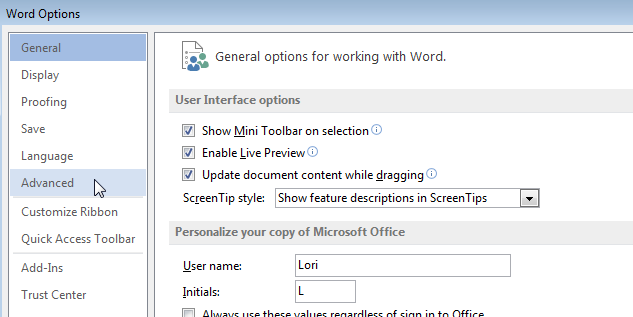 Word Options را مشاهده خواهید کرد. در منو سمت چپ آن بر روی گزینه