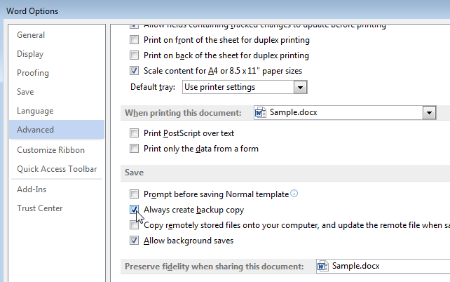 بکاپ از سند ورد شما چیزی بیش از یک کپی از آن نیست با این تفاوت که در ابتدا نام آن Backup of قرار گرفته است و دارای پسوند .wbk می باشد. توجه داشته باشید که تنها یک نسخه بکاپ از سند شما وجود خواهد داشت. هنگامی که شما دوباره سند خود را ذخیره می کنید ، فایل .wbk حذف خواهد شد و نسخه بروزرسانی آن جای .wbk را خواهد گرفت و سند دوباره به عنوان یک سند استاندارد ورد ذخیره می شود. به این نکته نیز توجه کنید که ایجاد یک بکاپ خودکار از سند شما نباید به طور همزمان به عنوان یک جایگزین برای نسخه پشتیبانی سند شما در رسانه های جمعی یا ذخیره سازی ها استفاده شود.