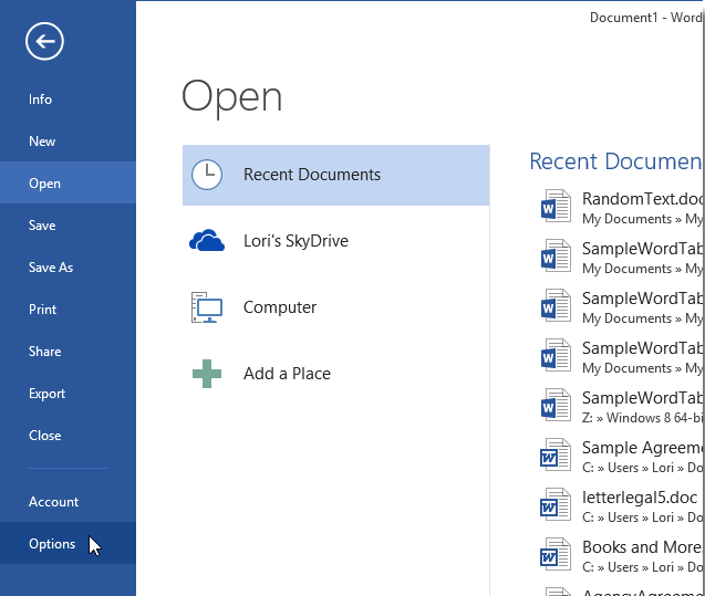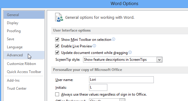 حال کادر محاوره ای Word Options برای شما نمایش داده خواهد شد. گزینه Advanced در منو سمت چپ این کادر محاوره ای انتخاب کنید.