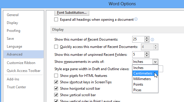 شما می توانید با استفاده از کادر محاوره ای Word Options واحدهای اندازه گیری را در خط کش را تغییر دهید و به واحدهای اندازه گیری مورد نظر خود تبدیل کنید.