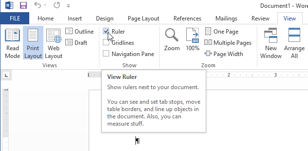 اگر خط کش در بالای سند شما نمایش داده نمی شود، در نوار ابزار بر روی تب View کلیک کرده و در بخش Show گزینه Ruler را انتخاب کنید. به این ترتیب خط کش در نوار ابزار شما نمایش داده خواهد شد.