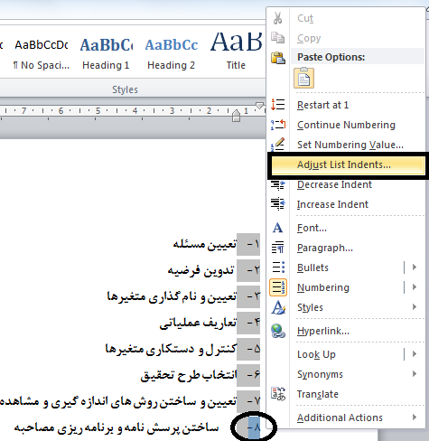 همانطور که در متن بالا مشاهده میکنید. بین شمارههای ۸، ۹ و ۱۰ با متن فاصله اضافی وجود دارد. برای رفع این مشکل در نرم افزار ورد لازم است، ابتدا روی یکی از این شمارهها کلیک کرده و پس از آن راست کلیک کنید تا منوی زیر باز شود. سپس گزینه