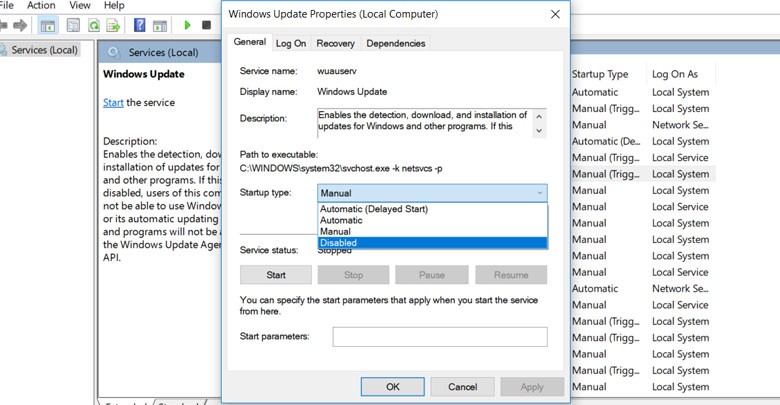 در کادر باز شده، از منوی کشویی Startup Type گزینه Disabled را انتخاب و OK کنید.