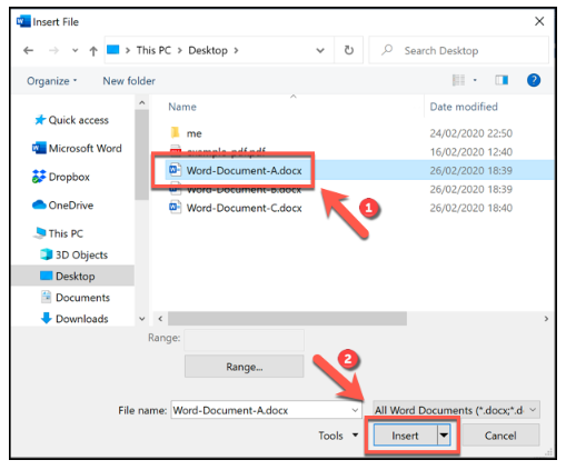 حال پنجره Insert File برای شما ظاهر می شود. در این پنجره اولین سند ورد خود را که می خواهید اضافه کنید را انتخاب نمایید. سپس بر روی گزینه Insert کلیک کنید تا به سند Word اضافه شود.
