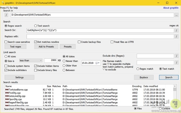 grepWin این است که می توانید نتایج خود را محدود به حجم آنها کنید. مثلا بخواهید که فقط فایل ها و نتایج بیشتر از ۱۰ مگابایت را به شما نمایش دهد. این برنامه