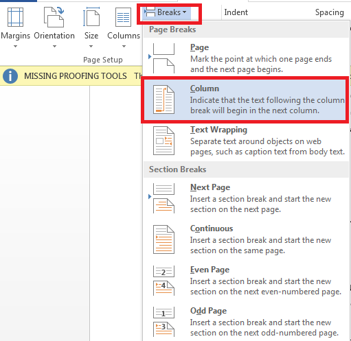 Column Break را انتخاب کنید. آنگاه یک فضای خالی برای نوشتن متن بالای جدول ایجاد خواهد شد. به همین سادگی