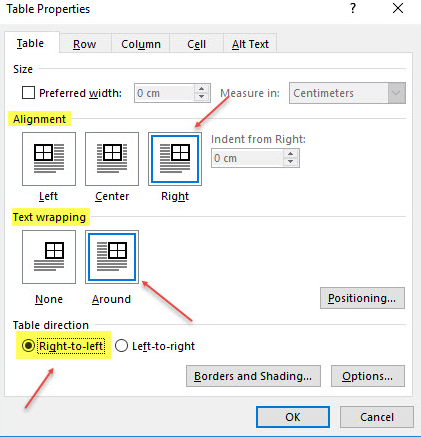 Table Properties برای شما باز خواهد شد. سه گزینه