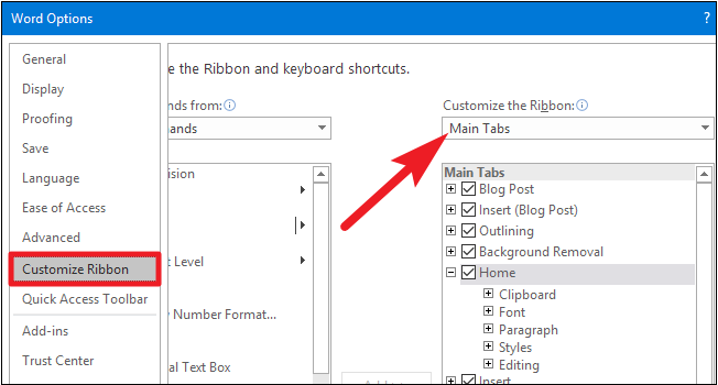 اکنون پنجره Word Options برای شما ظاهر خواهد شد. در منو سمت چپ پنجره باز شده شما باید بر روی گزینه Customize Ribbon کلیک کنید. سپس در سمت راست بر روی منو کشویی Customize the Ribbon کلیک کرده و در منو باز شده Main Tabs را انتخاب کنید.