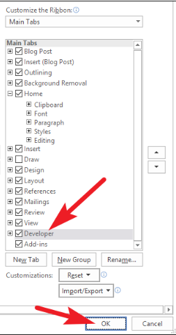 حال در لیست ظاهر شده Main Tabs، گزینه Developer را انتخاب کرده و در نهایت بر روی گزینه Ok کلیک کنید تا تغییرات اعمال شود.