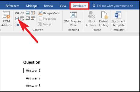اکنون تب Developer در نوار ابزار سند ورد شما ظاهر خواهد شد و شما می توانید آن را مشاهده کنید. برای افزودن check box به سند خود، مکان نما را در قسمتی که می خواهید آن را ایجاد کنید، قرار دهید. سپس، به تب Developer بروید و گزینه Check Box Content Control را انتخاب کنید.