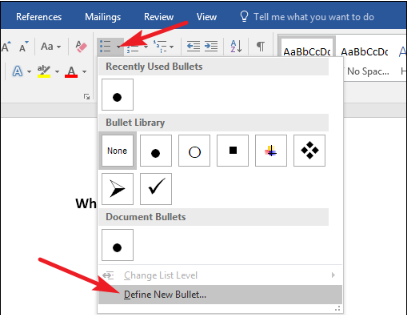 برای انجام این کار، به تب Home بروید و بر روی منو کشویی Bullet List کلیک کنید. سپس، در منو کشویی ظاهر شده گزینه Define new bullet را انتخاب کنید.