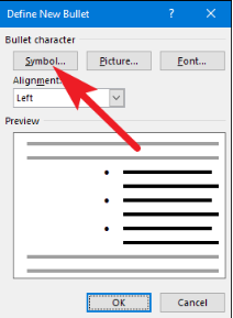 اکنون در پنجره Define New Bullet، بر روی گزینه Symbol کلیک کنید.