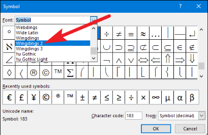 حال پنجره Symbol برای شما ظاهر خواهد شد، در این پنجره بر روی منو کشویی Font کلیک کرده و گزینه Wingdings 2 را انتخاب کنید.
