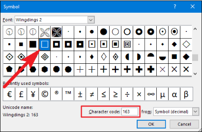 در این قسمت شما باید در بین نمادها، نماد مربع خالی که چک باکس را نشان می دهد، پیدا کنید. برای این کار می توانید در بین لیست به دنبال آن بگردید، یا با وارد کردن کد ۱۶۳ در قسمت Character Code به صورت خودکار آن را پیدا و انتخاب کنید. البته شما می توانید از هر نماد دلخواه دیگری برای پرسشنامه خود استفاده کنید.