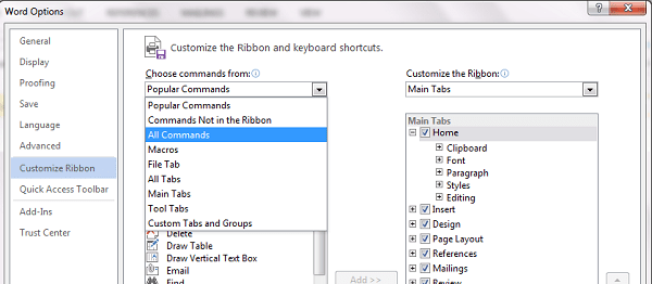 All commands را انتخاب کنید. آنگاه می توانید پیش نمایش تمام ویژگی های و ابزارهای موجود در نوار ابزار ورد را مشاهده کنید
