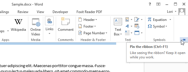 Ribbon را به حداقل برسانید ، تنها نام تب ها نمایش داده می شود. شما می توانید بر روی نام هر تب کلیک کنید تا ابزار ها و قابلیت های آن نمایش داده شود