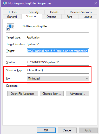 برای انجام دادن سریع بسته شدن برنامه غیر قابل بسته شدن ویندوز ، ما می توانیم میانبر صفحه کلید سفارشی ایجاد کنیم تا دستور Taskkill را اجرا کند. برای انجام این کار ، ابتدا بر روی new shortcut راست کلیک کرده و گزینه Properties را انتخاب کنید. به تب Shortcut رفته و در کادر Shortcut key یک میانبر صفحه کلید را انتخاب کنید. ویندوز به صورت اتوماتیک کلیدهای میانبر Ctrl + Alt را به هر کلید که شما فشار دهید اضافه خواهد کرد. به این نکته توجه داشته باشید که شما می توانید در صورت تمایل آن را به Ctrl + Shift تغییر دهید.