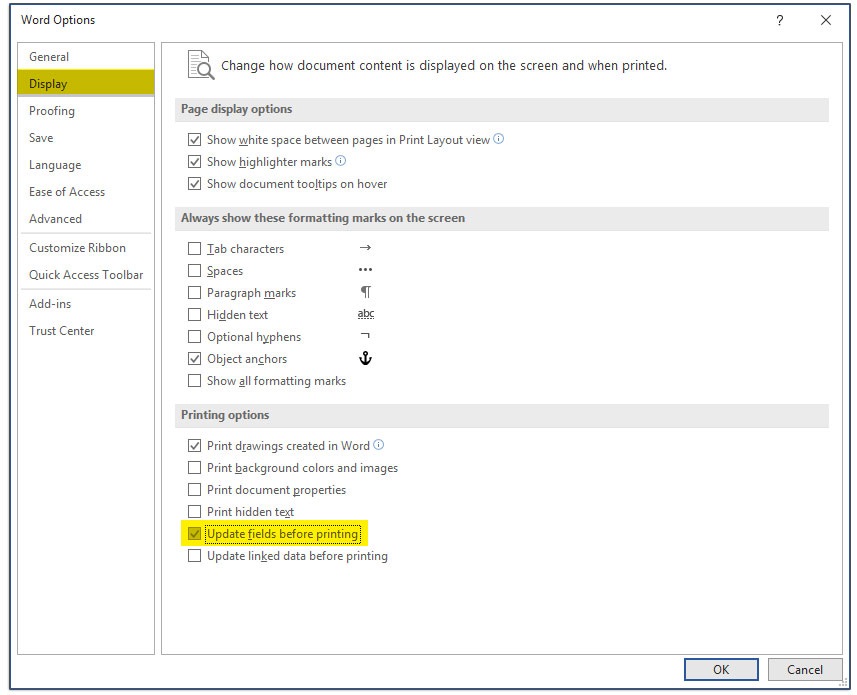 تنظیم به روز رسانی خودکار فیلدها قبل از چاپ سند