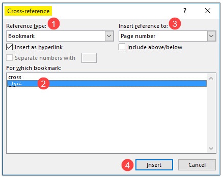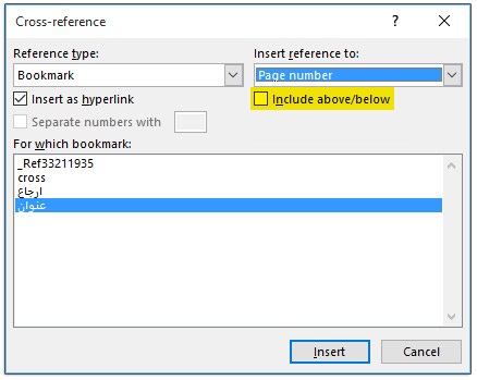 Above/below: با انتخاب این گزینه موقعیت مورد ارجاع شده درج میشود. Above یعنی بالا و Below به معنی پایین است؛