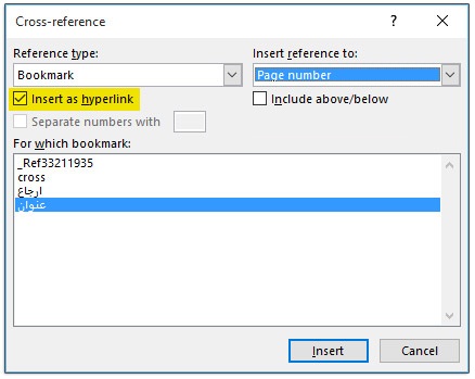 Bookmark موردنظر را در سند خود ایجاد کنید. سپس به مکان موردنظر برای ارجاع بروید و مثلا تایپ کنید (برای کسب اطلاعات بیشتر به صفحه شماره … مراجعه کنید.) سپس کلید