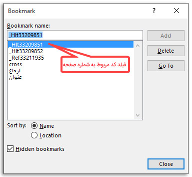 Bookmark مشاهده کنید. نام این نشانگرها با علامت (ـ) شروع میشوند. در تصویر زیر فیلد کد مربوط به شماره صفحه را در پنجره
