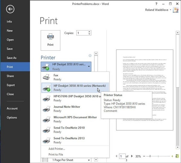 Printer پرینتری که می خواهید برای چاپ سند خود استفاده کنید را انتخاب کنید