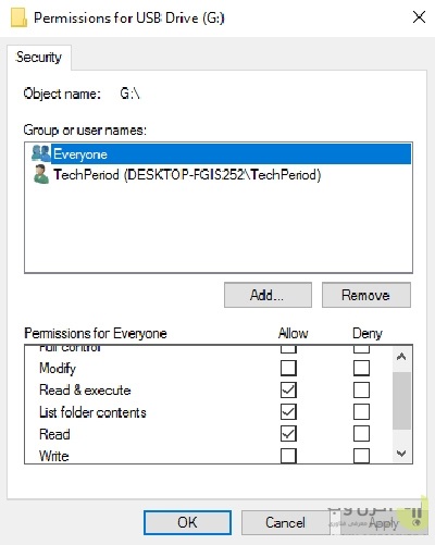 این بار از تب security گزینه Everyone را انتخاب کنید. روی Edit کلیک کنید تا بتوانید دسترسی به درایو USB را ویرایش نمایید.