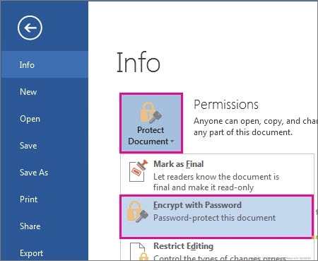 File > Info > Protect Document > Encrypt with Password بروید. در کادر