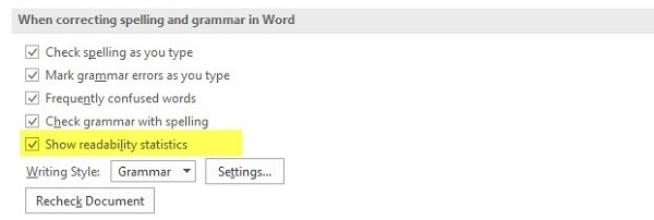 Show readability statistics را نیز فعال کنید تا میزان خوانایی متن شما نیز سنجیده شود. برای فعال کردن در