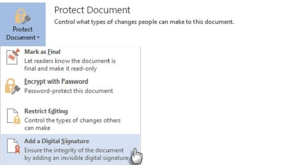 Protect Document / Protect Workbook / Protect Presentation را انتخاب و بر روی گزینه