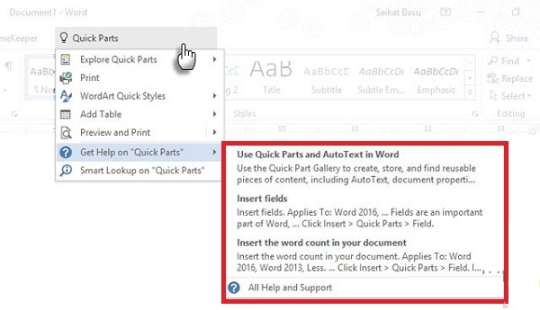 Quick parts شما میتوانید به صورت سریع به برخی ویژگی ها دسترسی داشته باشید. در صورت کلیک بر روی