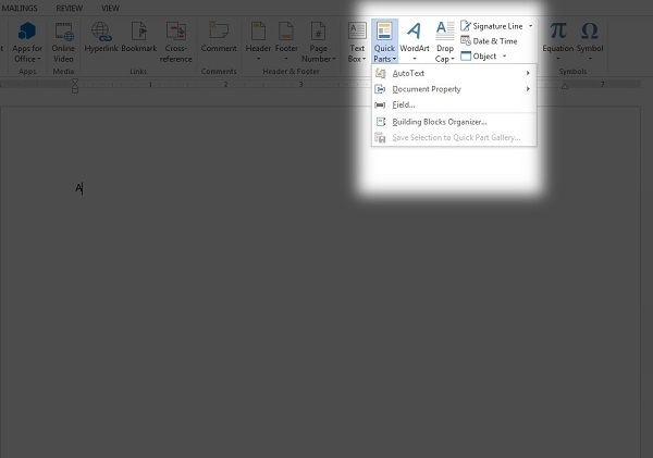 Insert tab > Text Group > Quick Parts به این بخش دسترسی پیدا کنید. بعد از اینکه بر روی این گزینه کلیک کردید میتوانید لیستی از قابلیت هایی که در اختیار شما قرار میدهد را مشاهده کنید. مثلا شما میتوانید از