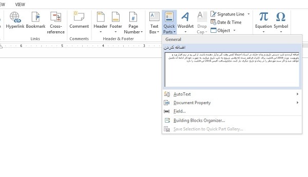 Quick Parts در دسترس شما می باشد که در واقع پر مصرف ترین ابزارها را در اختیارتان قرار میدهد. شما میتوانید یک یا چندین پاراگراف ، جعبه متن ، جداول ، لیست ، کاور صفحه ، واتر مارک یا هر شکل دیگری از محتوا را در فایل ورد خود با کمک