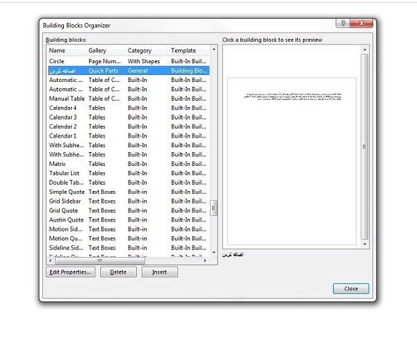 Building Blocks Organizer کلیک کنید پنجره ای برای شما باز خواهد شد که از این طریق قادر خواهید بود الگوهایی را که ایجاد کرده اید مشاهده ، حذف ، ویرایش و یا الگوی جدید اضافه کنید. البته یک سری الگوی پیش فرض آفیس نیز وجود دارد. برای کسب اطلاعات بیشتر در این مورد میتوانید به