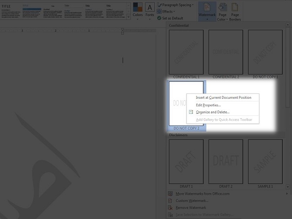 Design > Watermark را انتخاب کنید. بعد از انتخاب واترمارک ، یک سری لیست پیش فرض برای شما نمایش داده می شود. ولی برای ساخت واترمارک اختصاصی می بایست گزینه