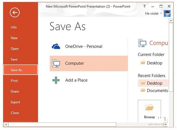 Save As را انتخاب کنید. در صورتی که فراموش کردید فایل پاورپوینت خود را ذخیره کنید پست